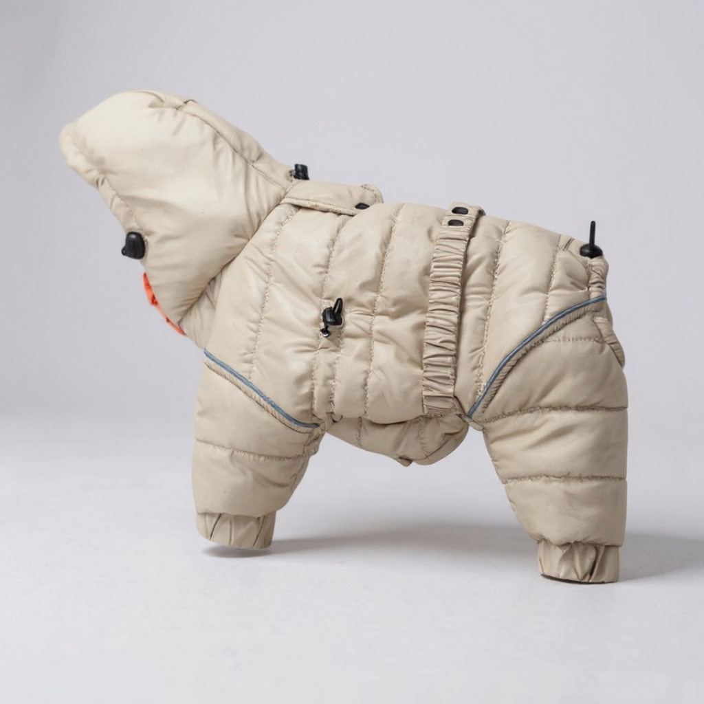 Custom Beige Puffer Dog Suit: Wind Resistant Winter Overall