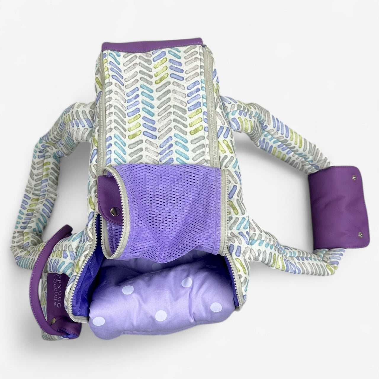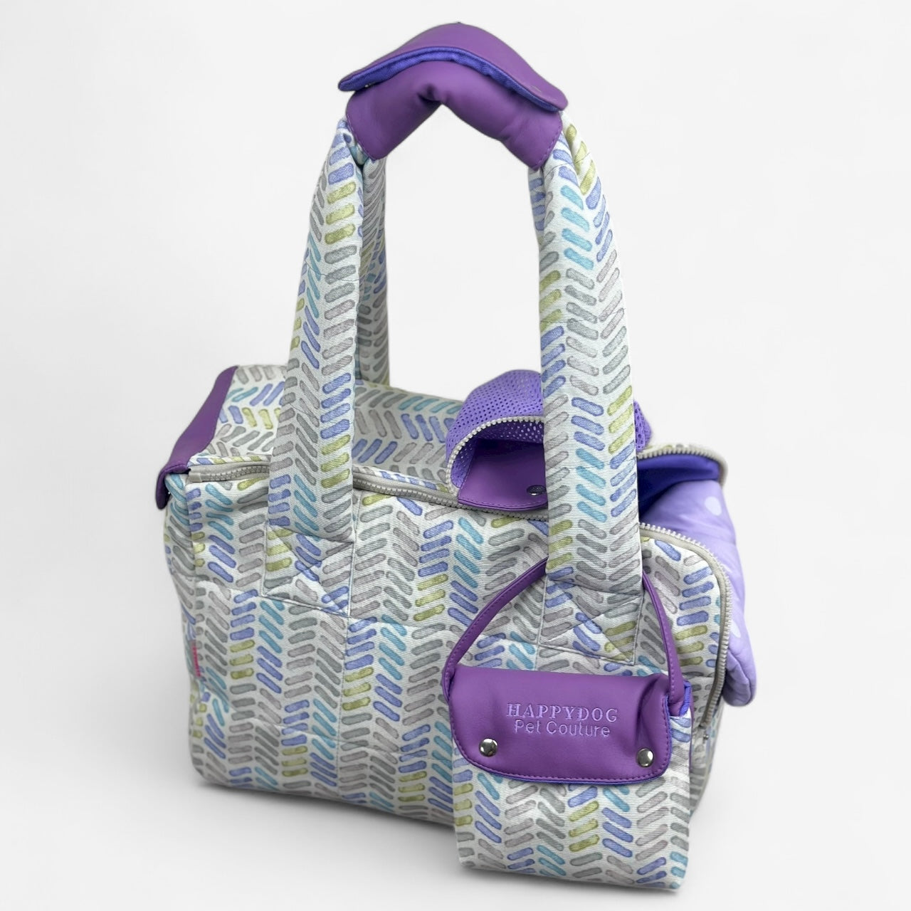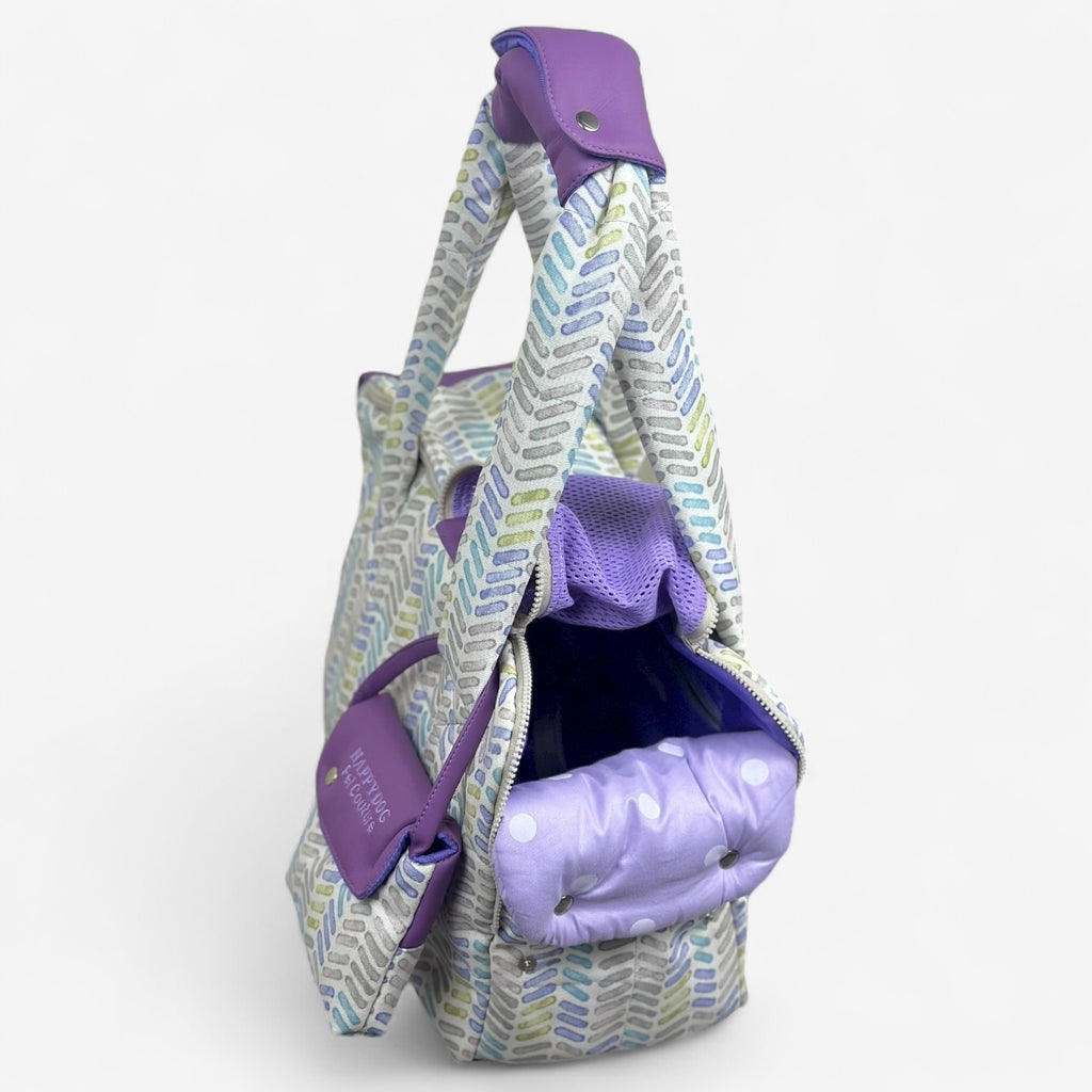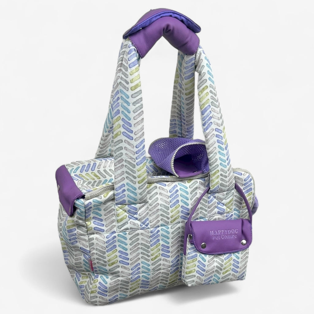 Beige and lavender designer dog carrier with mesh window