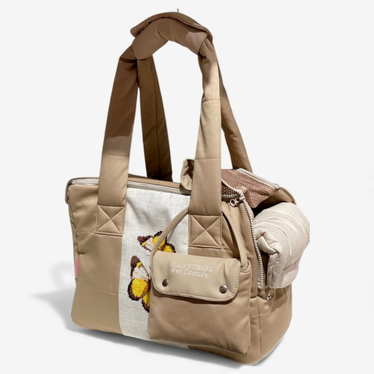 One-of-a-Kind XS Beige Dog Carrier with Hand-Embroidered Butterflies