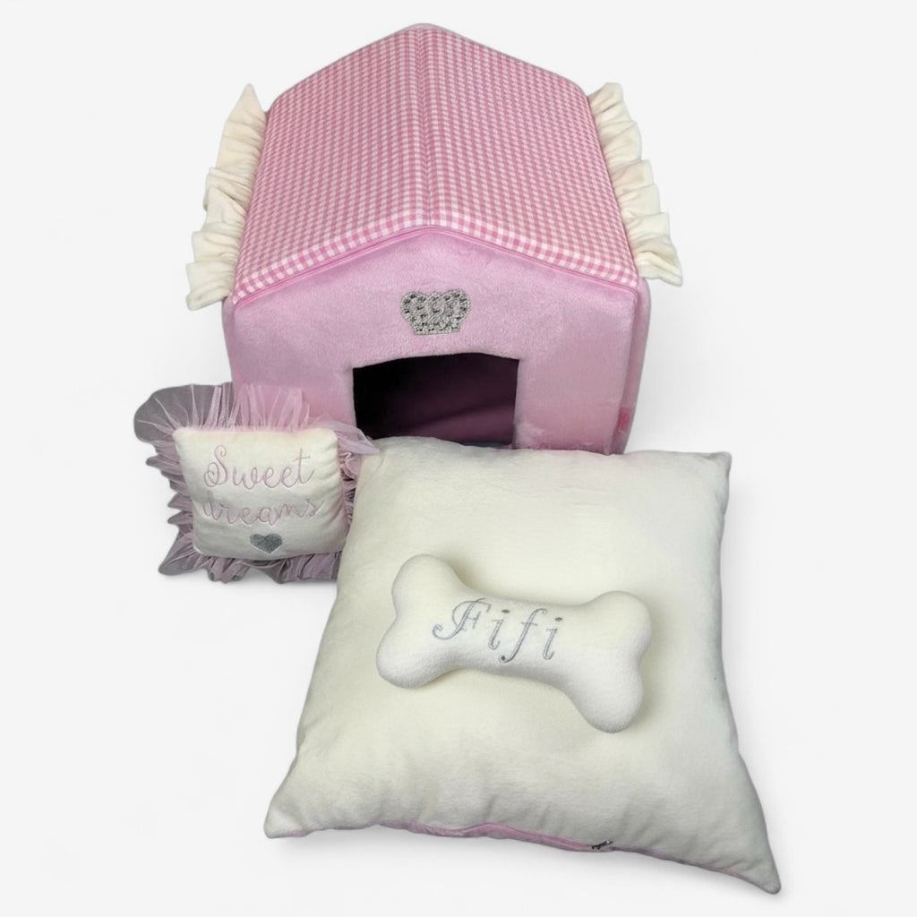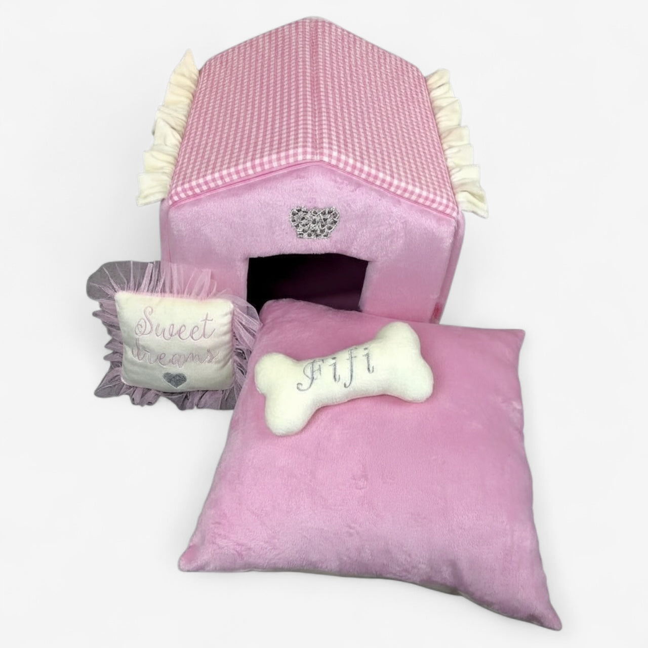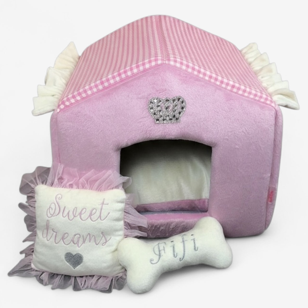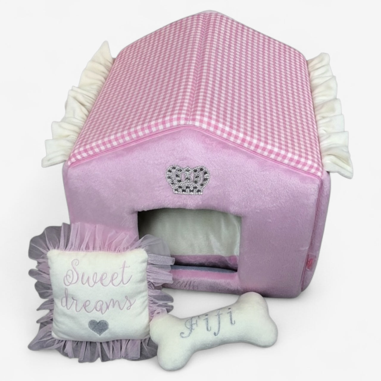 This pet house is designed for princess dogs and features a baby pink checkered pattern. It comes equipped with a zipper and is conveniently packed in a bag for easy transport.