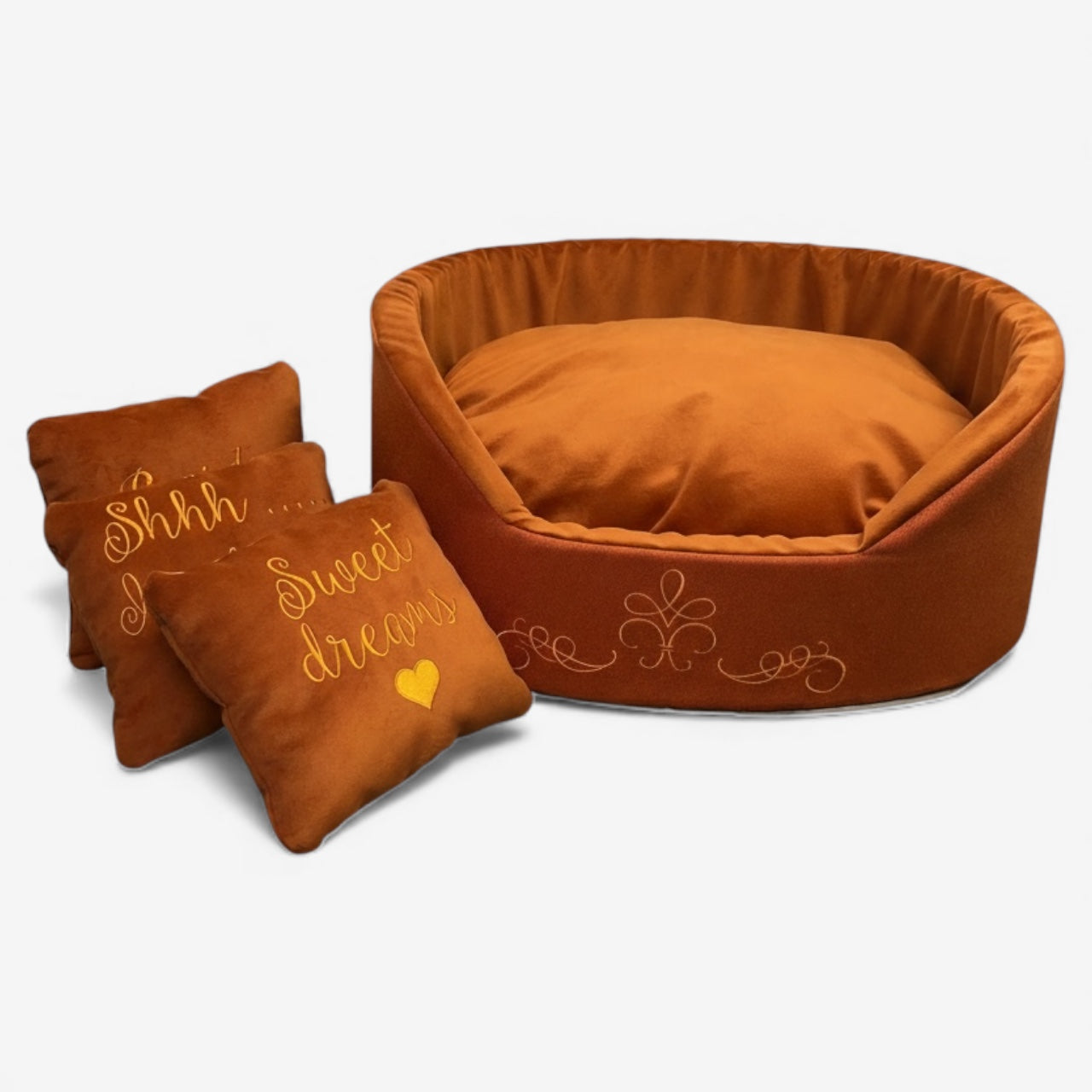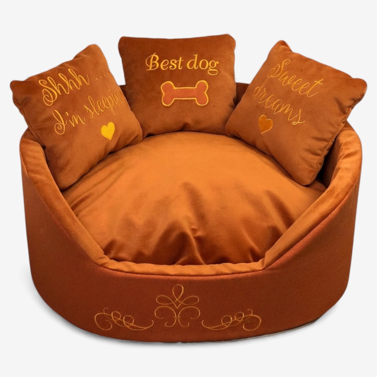 Terracotta Luxury Dog Bed – Handmade Velvet Pet Bed with Embroidered Pillows