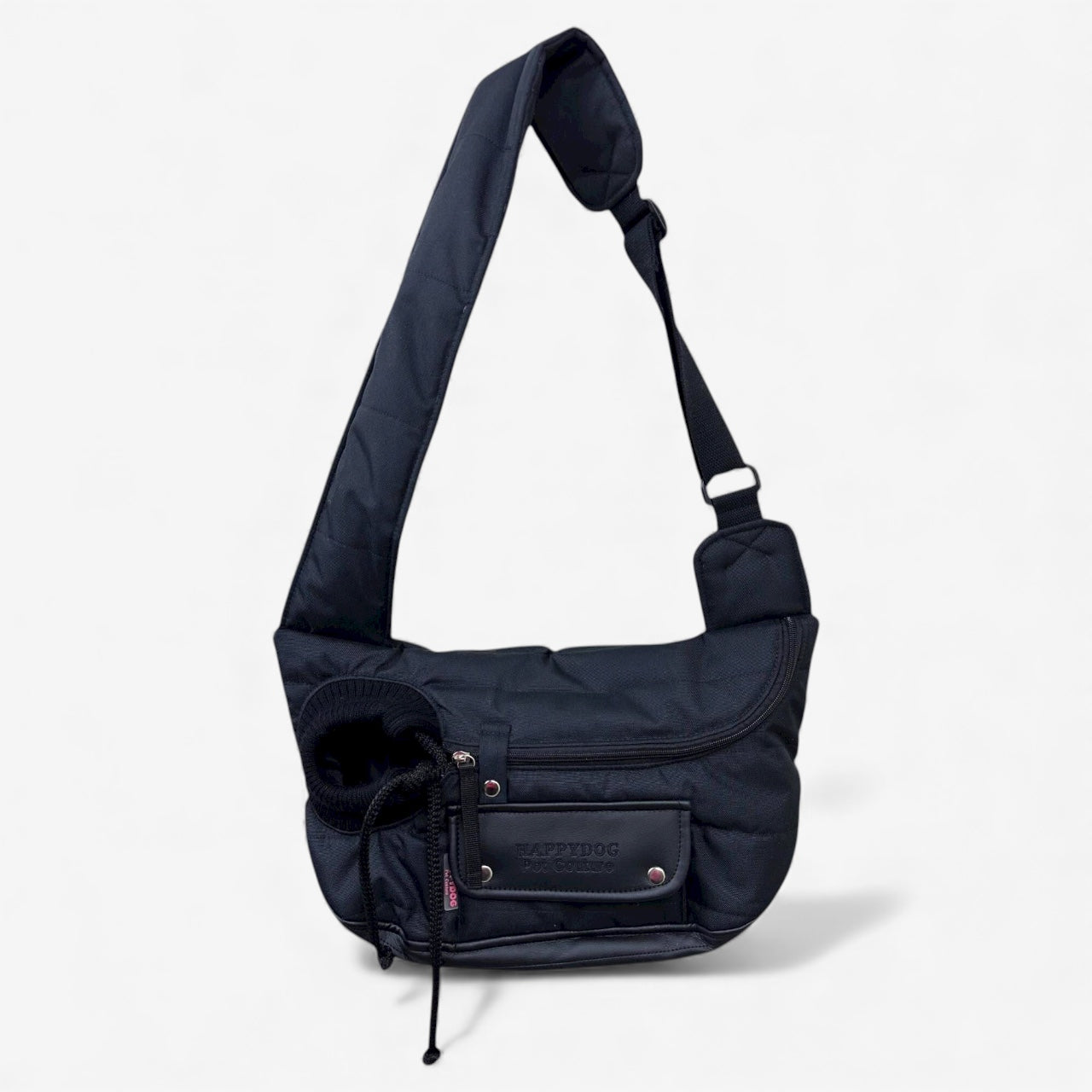 The Black Oxford Sling Dog Carrier from HAPPYDOG COUTURE is a stylish and functional accessory for everyday adventures with your small dog. Crafted from durable waterproof Oxford fabric, this sleek all-black carrier features elegant faux leather pockets, soft minky lining, and embroidered HAPPYDOG branding.