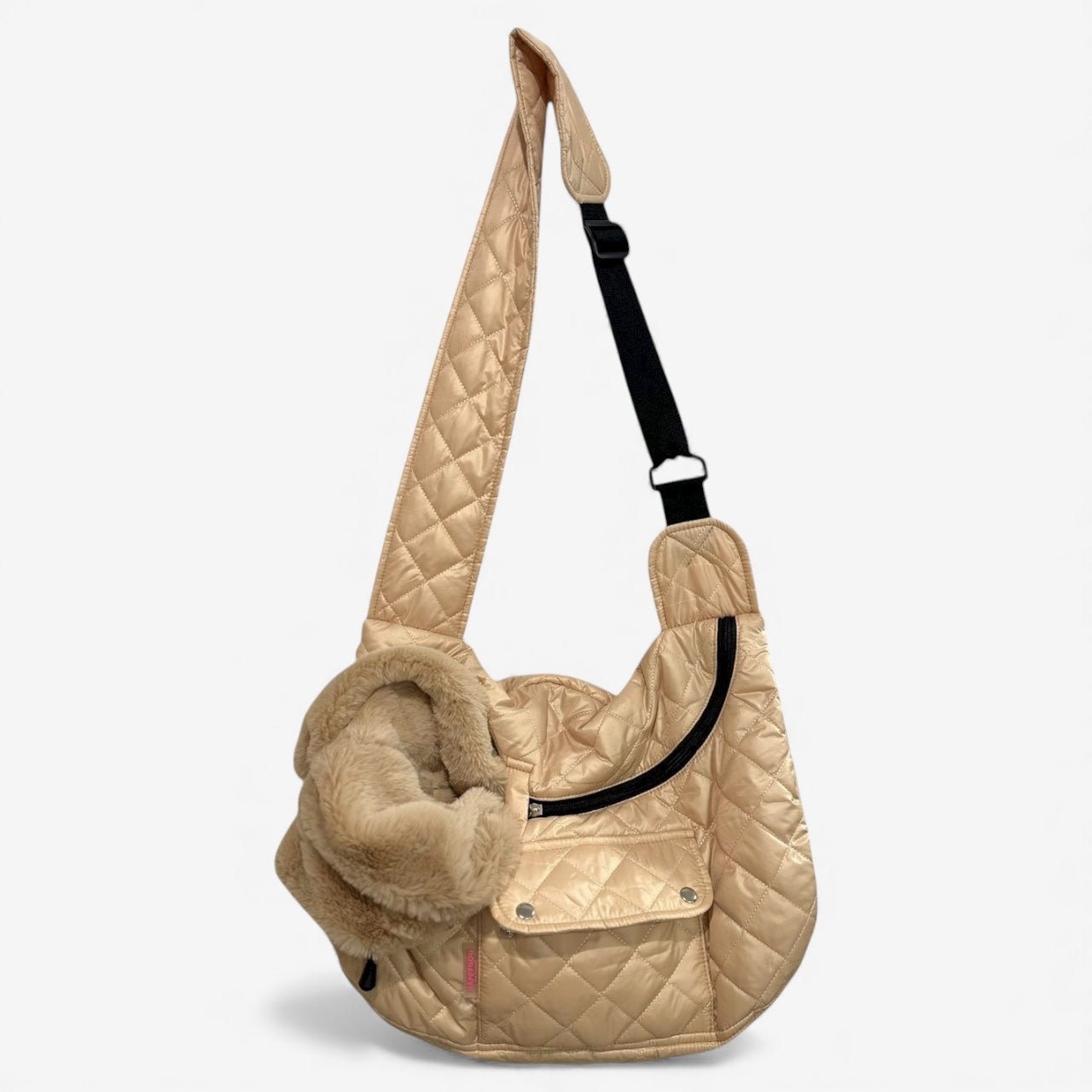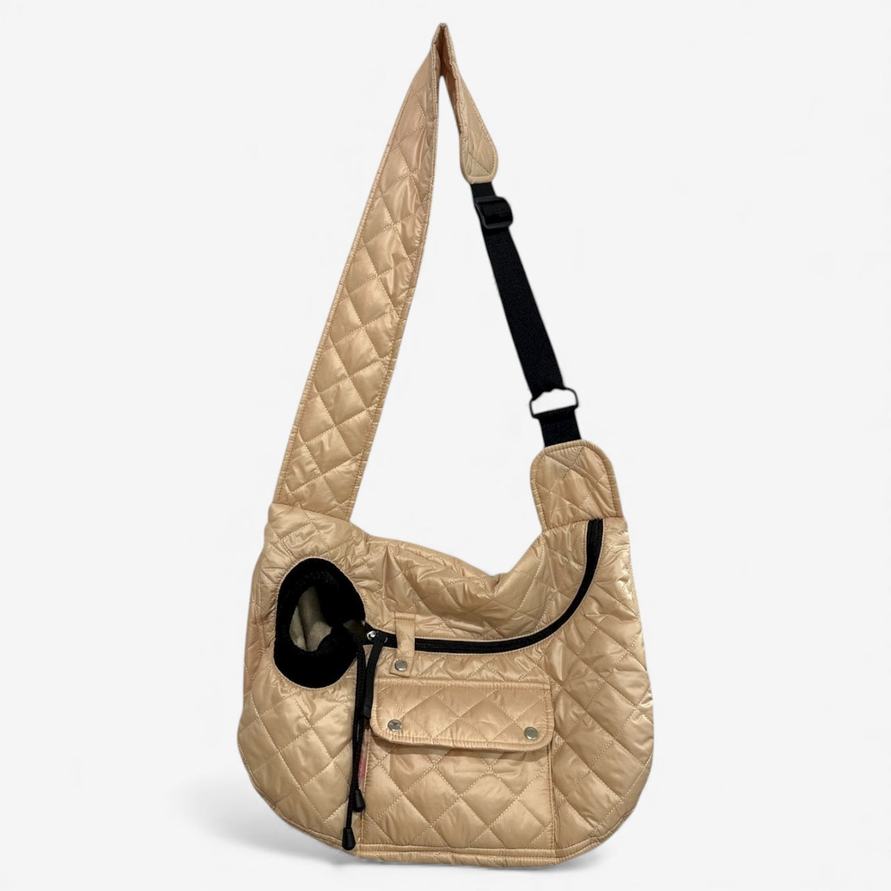 This stylish and ultra-lightweight, thin honey caramel sling bag is designed for small dogs and puppies, offering a breathable and comfortable carrying option. Made from water-repellent quilted fabric in a warm honey caramel shade, it provides protection against light rain and dirt while keeping your pup snug and secure.